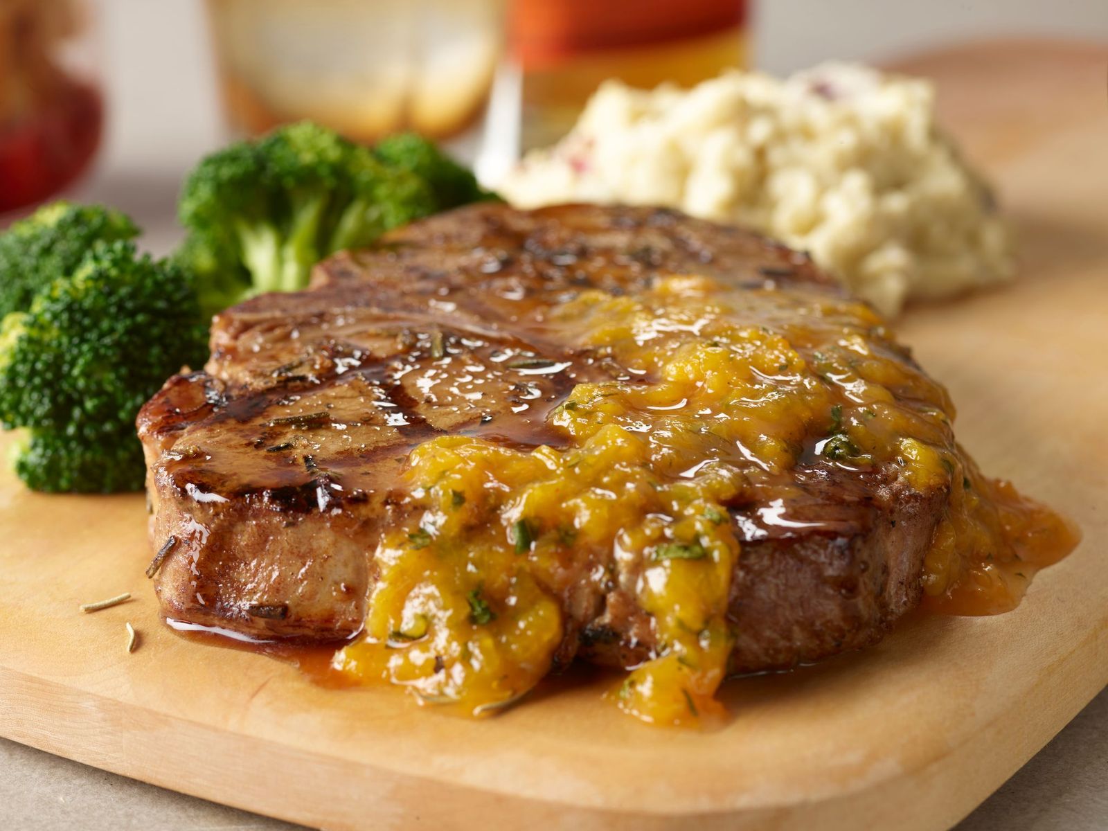 Pork Porterhouse – A 12 oz. chargrilled pork porterhouse topped with peach chutney and served with choice of two regular sides. Available served two ways: seasoned with garlic and herbs or glazed with Bulleit® Bourbon and brown sugar. $18.99.